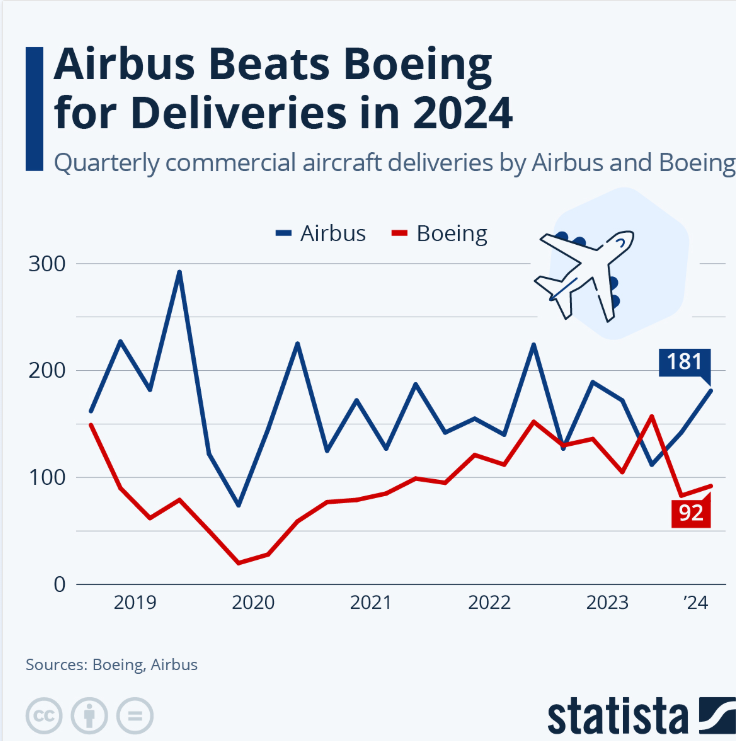 Dans les livraison trimestrielles d’avions commerciaux, Airbus dépasse Boeing en 2024.