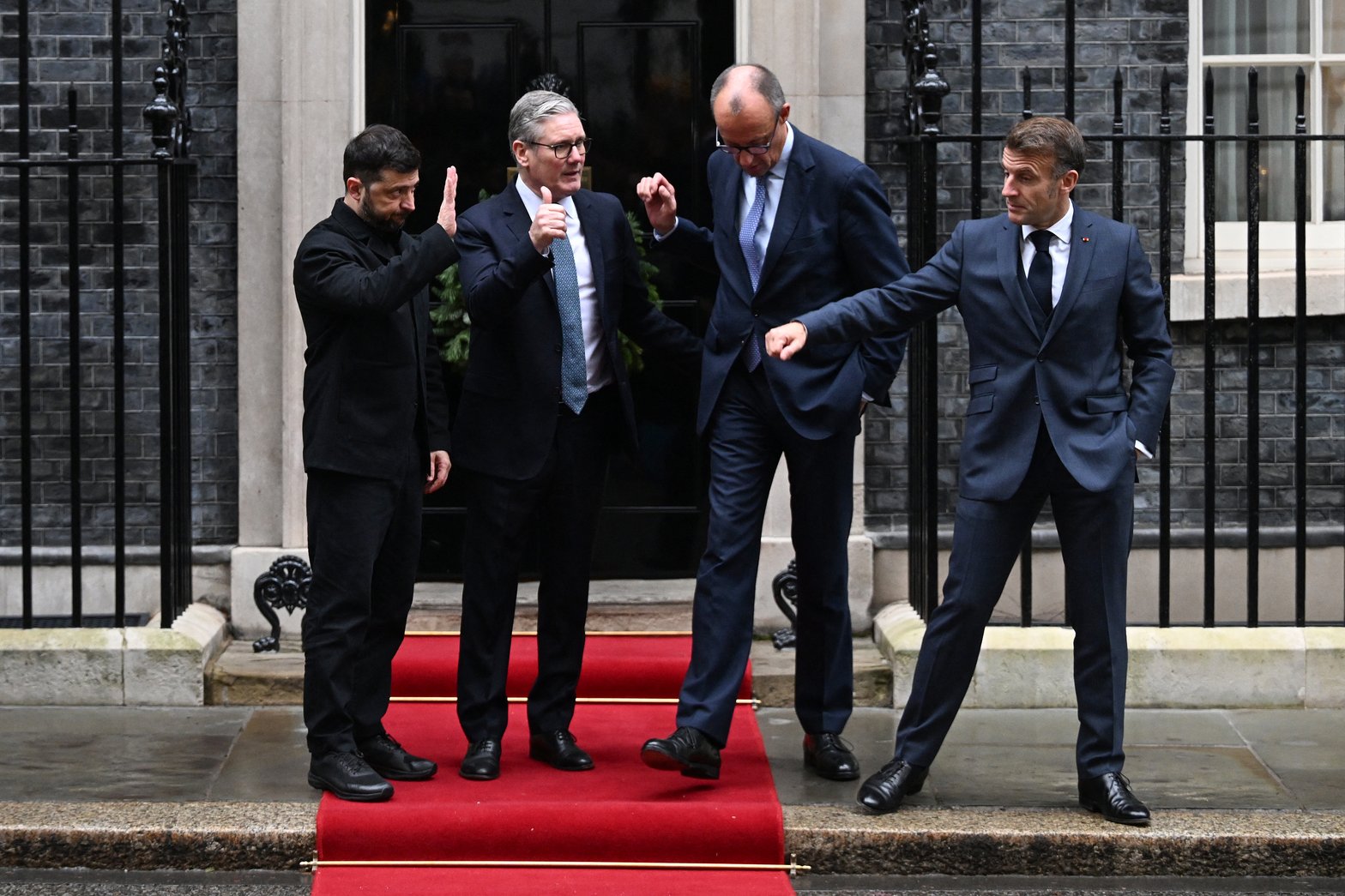 Le président ukrainien Volodymyr Zelensky (à gauche), le Premier ministre britannique Keir Starmer (deuxième à gauche), le chancelier allemand Friedrich Merz (deuxième à droite) et le président français Emmanuel Macron (à droite) devant le 10 Downing Street après leurs entretiens dans le centre de Londres le 8 décembre 2025. (Chris J Ratcliffe / AFP)