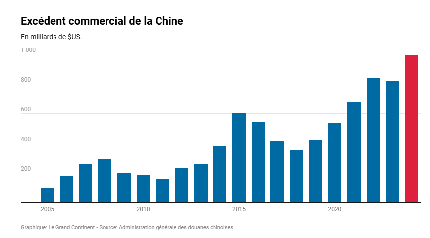 C’est fait. Pour la première fois de son histoire, l’excédent commercial chinois a dépassé 1000 milliards de dollars sur un an - pour l’année écoulée fin novembre. Le défi à relever pour ses partenaires commerciaux est ainsi plus colossal que jamais. Tous ne sont toutefois pas logés à la même enseigne. Donald Trump recueille les premiers fruits de son bras de fer commercial, tandis que l’Europe apparaît de plus en plus vulnérable. Depuis le début de 2025, les exportations chinoises vers l’Europe ont progressé de 8,1%, tandis que celles vers les Etats-Unis chutaient de 18,9%. A l’occasion de sa visite d’Etat en Chine, Emmanuel Macron a brandi la menace de “mesures fortes”, “comme des droits de douane sur les produits chinois”. Il reste à mettre la menace à exécution.