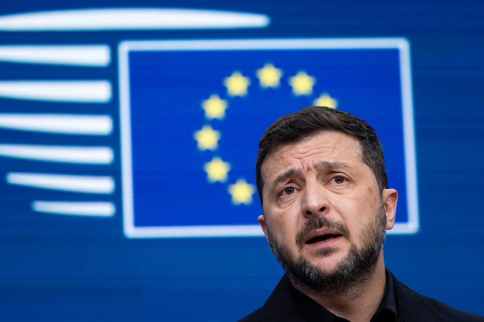 Le président ukrainien Volodymyr Zelensky tient une conférence de presse lors du sommet du Conseil européenle 23 octobre 2025, qui réunit les dirigeants de l'UE. Parmi les sujets abordés figurent l'engagement européen d'un prêt de 140 milliards d'euros en faveur de l'Ukraine, financé par le gel des avoirs russes. (AFP)