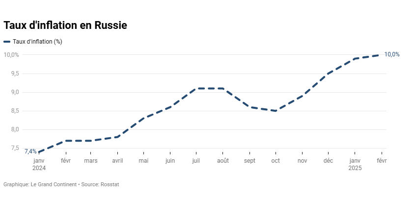 La Banque centrale de Russie a annoncé le 6 juin la baisse de son taux d’intérêt de référence, de 21 à 20%. Cette baisse, la première depuis 2022, est rendue possible par le relâchement des tensions inflationnistes, a expliqué la gouverneure de la Banque Centrale de Russie, Elvira Nabiullina. Les prix continuent toutefois de grimper de plus de 10% par an, bien au-delà de l’objectif de 4% maintenu pour l’an prochain.
